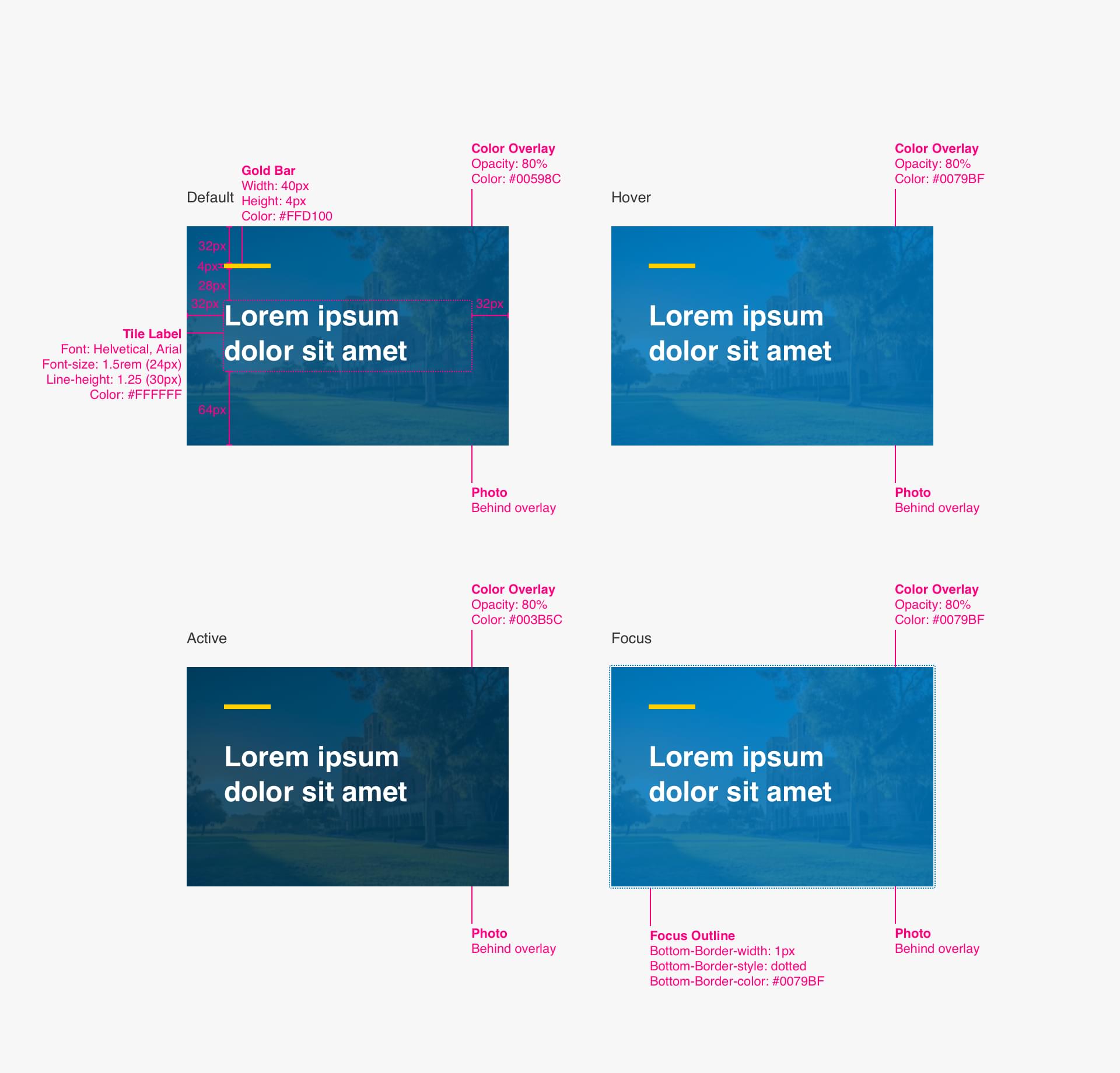 • Link the tile’s headline, heading or title to provide the most succinct description to screen readers and search engines. Both technologies use links to understand and navigate document structure.